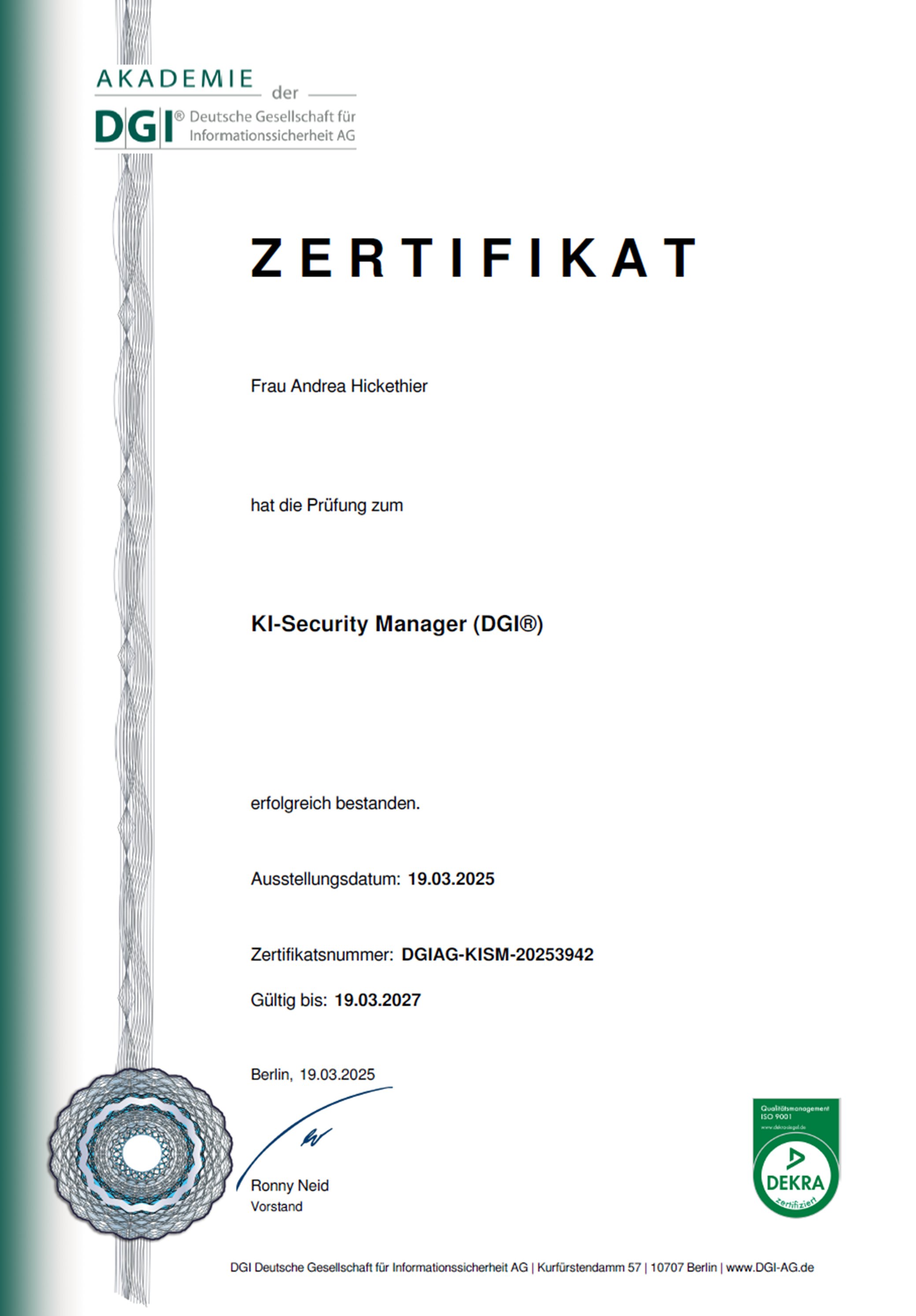 Andrea Hickethier als AI Security Managerin nach ISO 42001 zertifizieren lassen.